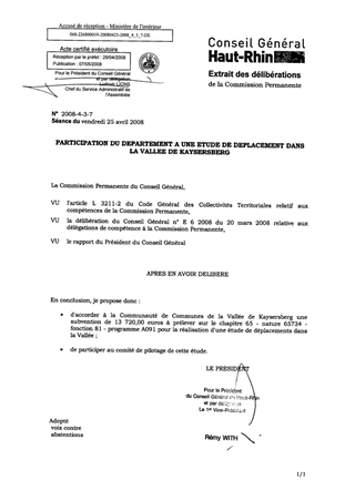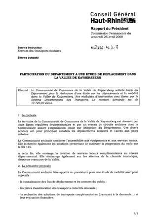 La Communauté de Communes de la Vallée de Kaysersberg sollicite l'aide du Département pour la réalisation d'une étude sur les déplacements et la mobilité dans la Vallée de Kaysersberg. Nos modalités d'intervention sont fixées par le Schéma Départemental des Transports. Le montant demandé est de 13 720,00 euros.