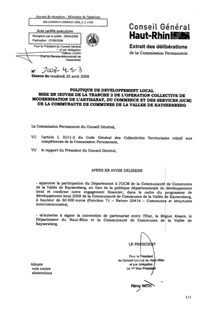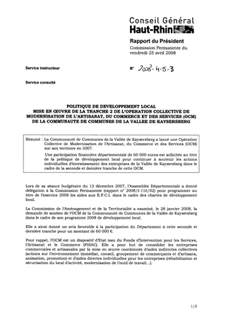 La Communauté de Communes de la Vallée de Kaysersberg a lancé une Opération Collective de Modernisation de l’Artisanat, du Commerce et des Services (OCM) sur son territoire en 2007. Une participation financière départementale de 60 000 euros est sollicitée au titre de la politique de développement local pour continuer à soutenir les actions individuelles d’investissement des entreprises de la Vallée de Kaysersberg dans le cadre de la seconde et dernière tranche de cette OCM.