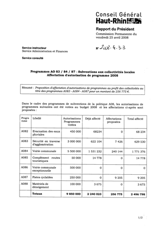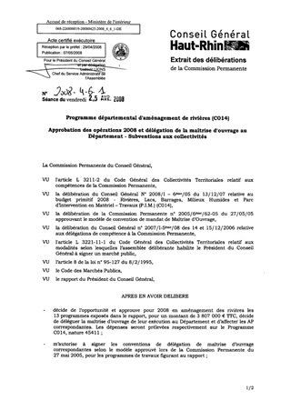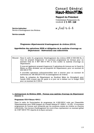 Dans le cadre du programme d’aménagement des rivières 2008 (4 000 000 €), il vous est proposé d’approuver 13 nouveaux programmes de travaux pour un montant total de 3 807 000 € TTC et d'en confier la maîtrise d’ouvrage au Département. Il vous est également proposé d'approuver 5 opérations de travaux sur le Canal du Rhône au Rhin déclassé, qui est propriété du Département, pour un montant de 200 000 € TTC. 6 nouvelles opérations subventionnables sont à inscrire pour un montant de subvention de 186 000,00 € TTC en aménagement de rivières. Enfin, la cotisation du Département au Syndicat Mixte du Strengbach pour l'année 2006 n'ayant pas été payée à ce jour est à réaliser sur le budget 2008 pour un montant de 3 250 €.