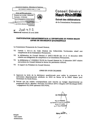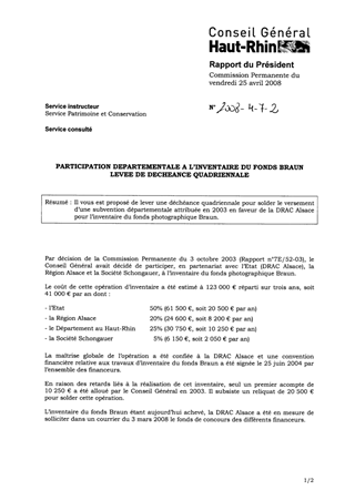 Il vous est proposé de lever une déchéance quadriennale pour solder le versement d’une subvention départementale attribuée en 2003 en faveur de la DRAC Alsace pour l’inventaire du fonds photographique Braun