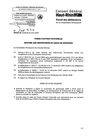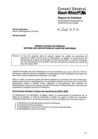 Il vous est proposé, dans le présent rapport de valider la convention de partenariat 2008 à 2010 entre le Département, la Région, la Communauté de Communes de la région de Guebwiller, la Ville de Guebwiller et l'Institut Européen des Arts Céramiques et de prendre acte des informations relatives au comité de suivi de l'année 2007