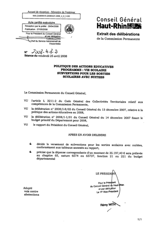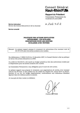 Dans le cadre du BP 2008, le Conseil Général a donné délégation à la Commission Permanente pour l'affectation des subventions liées à la vie scolaire. Le présent rapport propose d'attribuer une subvention de 15 000 € à l'association EDUC'ENVIA 68, dont le rôle est de promouvoir les sorties scolaires avec nuitées, dans les centres alsaciens.
