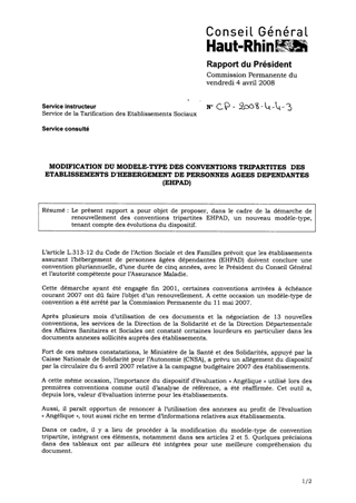Le présent rapport a pour objet de proposer, dans le cadre de la démarche de renouvellement des conventions tripartites EHPAD, un nouveau modèle-type, tenant compte des évolutions du dispositif.