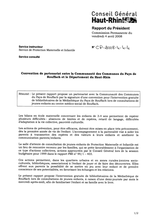 Le présent rapport propose un partenariat avec la Communauté des Communes du Pays de Rouffach par la signature d’une convention pour l’intervention gratuite de bibliothécaires de la Médiathèque du Pays de Rouffach lors de consultations de jeunes enfants au centre médico-social de Rouffach.