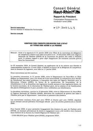 Suite à la signature le 31 janvier 2006 avec l’Etat de la convention de délégation de compétence relative aux aides à la pierre et le 19 décembre 2006 avec l’Agence Nationale de l’Habitat (ANAH) de la convention de gestion des aides à l’Habitat privé, le présent rapport a pour objet d’approuver les avenants annuels prévus dans les conventions.