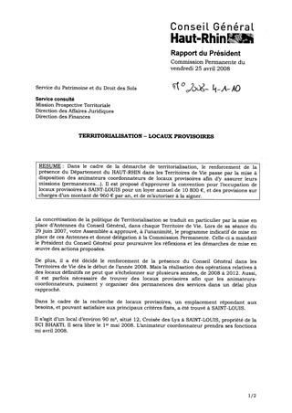 Dans le cadre de la démarche de territorialisation, le renforcement de la présence du Département du HAUT-RHIN dans les Territoires de Vie passe par la mise à disposition des animateurs coordonnateurs de locaux provisoires afin d’y assurer leurs missions (permanences…). Il est proposé d’approuver la convention pour l’occupation de locaux provisoires à SAINT-LOUIS pour un loyer annuel de 10 800 €, et des provisions sur charges d’un montant de 960 € par an, et de m’autoriser à la signer.