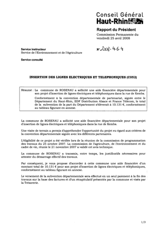 La commune de ROSENAU a sollicité une aide financière départementale pour son projet d’insertion de lignes électriques et téléphoniques dans la rue de Kembs. Conformément à la convention départementale de partenariat, signée entre le Département du Haut-Rhin, EDF Distribution Alsace et France Télécom, le total de la subvention de la part du Département s’élèverait à 10.131 €, conformément au tableau figurant en annexe.