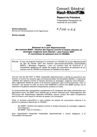 Il vous est proposé d'autoriser le versement au CNASEA de la part départementale au titre de l’année 2007 des mesures agro-environnementales territorialisées (MAET) « Montagne Vosgienne » pour un montant total de 98.832,32 €. Il conviendrait également de valider les projets de conventions de paiement de ces contrats avec le CNASEA et d’autoriser le Président à les signer