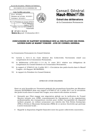 Le présent rapport a pour objet de faire la synthèse des propositions formulées par Monsieur Jacques SICHERMAN, Ingénieur Général des Ponts, des Eaux et des Forêts à la demande de Madame la Ministre de l’Ecologie du Développement Durable des Transports et du Logement sur la circulation des poids lourds dans le Massif Vosgien et de donner notre avis sur les mesures envisagées.
