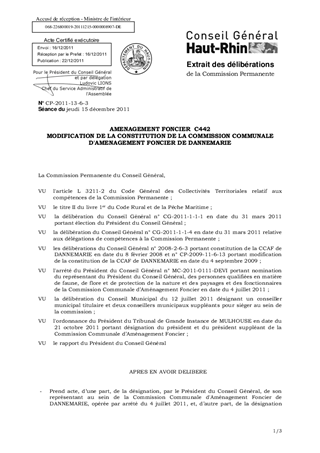 Suite à la désignation de son représentant au sein de la Commission Communale d’Aménagement Foncier de DANNEMARIE par le Président du Conseil Général après les élections cantonales de mars 2011 et suite à l’ordonnance du Tribunal de Grande Instance de Mulhouse en date du 21 octobre 2011 désignant un nouveau président pour cette Commission, il y a lieu de délibérer pour prendre acte de ces changements et approuver la nouvelle composition de cette Commission Communale d’Aménagement Foncier.