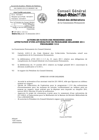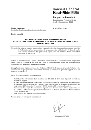 Le présent rapport a pour objet, en application du règlement financier de procéder à l’affectation d’une autorisation de programme du millésime 2011 dans le cadre des actions en faveur des personnes âgées pour un montant d’une subvention attribuée de 231 000 €.