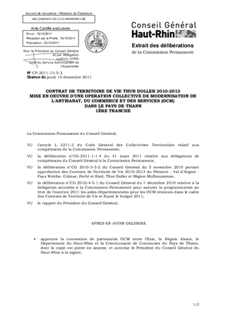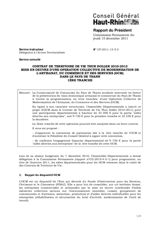 La Communauté de Communes du Pays de Thann souhaite intervenir en faveur de la préservation du tissu économique artisanal et commercial du Pays de Thann à travers la programmation, en trois tranches, d'une Opération Collective de Modernisation de l'Artisanat, du Commerce et des Services (OCM). Eu égard à son caractère structurant, l'Assemblée Départementale a inscrit ce projet d'OCM dans le Contrat de Territoire de Vie Thur Doller 2010-2013, pour une participation départementale à hauteur de 33 000 € pour la partie "aides directes aux entreprises", soit 9 750 € pour la première tranche et 23 250 € pour la deuxième. La 3ème tranche de cette opération pourrait être analysée dans un futur contrat. Il vous est proposé : - d'approuver la convention de partenariat liée à la 1ère tranche de l'OCM et d'autoriser le Président du Conseil Général à signer cette convention, - de confirmer l'engagement financier départemental de 9 750 € pour la partie "aides directes aux entreprises" de la 1ère tranche de cette OCM.