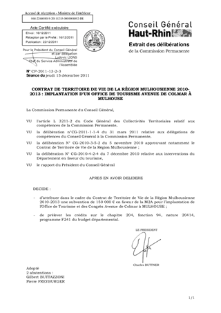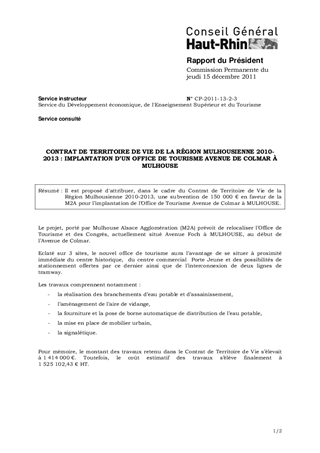 Il est proposé d'attribuer, dans le cadre du Contrat de Territoire de Vie de la Région Mulhousienne 2010-2013, une subvention de 150 000 € en faveur de la M2A pour l’implantation de l’Office de Tourisme Avenue de Colmar à MULHOUSE.