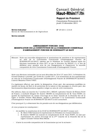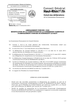 Suite aux nouvelles désignations et nominations de membres et de représentants au sein de la Commission Communale d’Aménagement Foncier de BURNHAUPT-LE-HAUT, opérées par le Président du Conseil Général après les élections cantonales de mars 2011 et par le directeur du SEGAT, il y a lieu de délibérer pour prendre acte de ces changements et d’approuver la nouvelle composition de cette Commission Communale d’Aménagement Foncier.