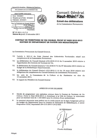 Dans le cadre de la politique départementale en faveur des médiathèques, il vous est proposé de programmer définitivement une opération retenue au titre du Contrat de Territoire de Vie « Colmar-Fecht-Ried » pour un montant total de subvention de 1 310 000 €.