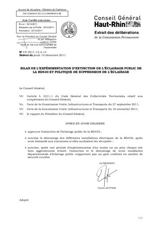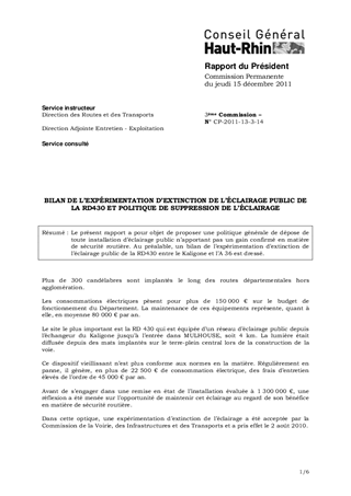 Le présent rapport a pour objet de proposer une politique générale de dépose de toute installation d’éclairage public n’apportant pas un gain confirmé en matière de sécurité routière. Au préalable, un bilan de l’expérimentation d’extinction de l’éclairage public de la RD430 entre le Kaligone et l’A 36 est dressé.