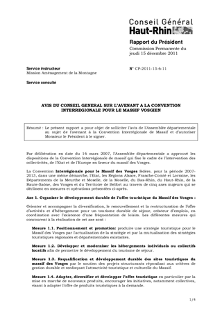 Le présent rapport a pour objet de solliciter l’avis de l’Assemblée départementale au sujet de l’avenant à la Convention Interrégionale de Massif et d’autoriser Monsieur le Président à le signer.