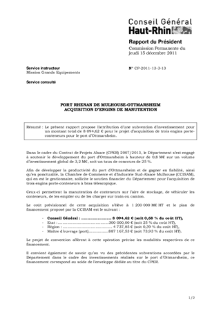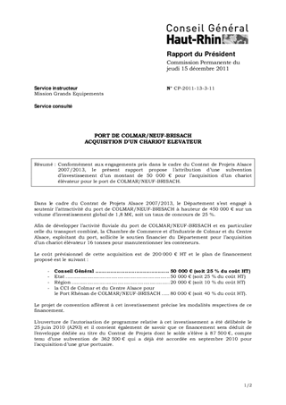 Conformément aux engagements pris dans le cadre du Contrat de Projets Alsace 2007/2013, le présent rapport propose l’attribution d’une subvention d’investissement d’un montant de 50 000 € pour l’acquisition d’un chariot élévateur pour le port de COLMAR/NEUF-BRISACH.
