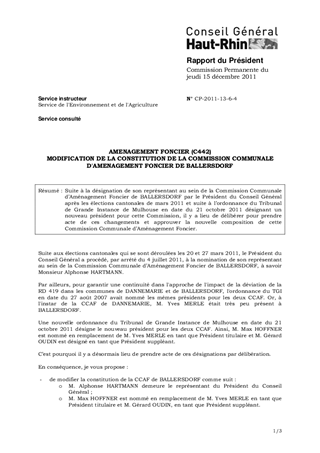 Suite à la désignation de son représentant au sein de la Commission Communale d’Aménagement Foncier de BALLERSDORF par le Président du Conseil Général après les élections cantonales de mars 2011 et suite à l’ordonnance du Tribunal de Grande Instance de Mulhouse en date du 21 octobre 2011 désignant un nouveau président pour cette Commission, il y a lieu de délibérer pour prendre acte de ces changements et approuver la nouvelle composition de cette Commission Communale d’Aménagement Foncier.