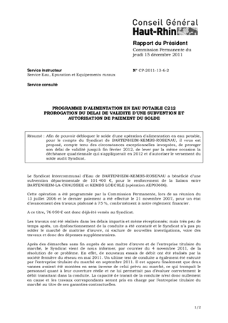 Afin de pouvoir débloquer le solde d'une opération d'alimentation en eau potable, pour le compte du Syndicat de BARTENHEIM-KEMBS-ROSENAU, il vous est proposé, compte tenu des circonstances exceptionnelles invoquées, de proroger son délai de validité jusqu'à fin février 2012, de lever par la même occasion la déchéance quadriennale qui s'appliquerait en 2012 et d'autoriser le versement du solde audit Syndicat.