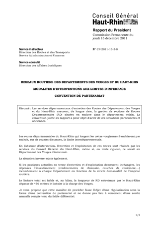 Les services départementaux d'entretien des Routes des Département des Vosges et du Haut-Rhin assurent, de longue date, la gestion de sections de Routes Départementales (RD) situées en enclave dans le département voisin. La convention jointe au rapport a pour objet d'acter de ces situations particulières et anciennes.