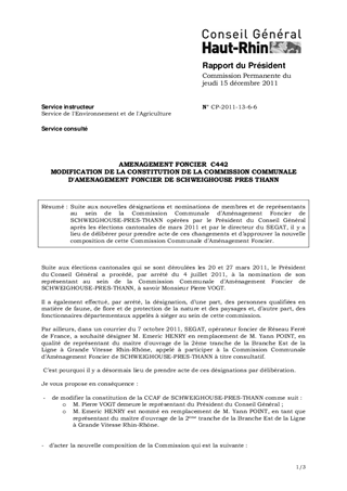 Suite aux nouvelles désignations et nominations de membres et de représentants au sein de la Commission Communale d’Aménagement Foncier de SCHWEIGHOUSE-PRES-THANN opérées par le Président du Conseil Général après les élections cantonales de mars 2011 et par le directeur du SEGAT, il y a lieu de délibérer pour prendre acte de ces changements et d’approuver la nouvelle composition de cette Commission Communale d’Aménagement Foncier.