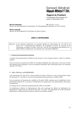 Il est proposé d'attribuer un montant global de subventions de 179 729 € en faveur de 4 établissements hôteliers, de prolonger la durée de validité de la subvention accordée à la Sàrl "Côté Lac" lors de la Commission Permanente du 4 juillet 2008 et d'approuver un avenant à la convention afférente.