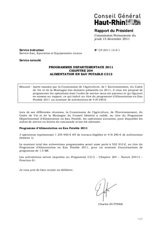 Après examen par la Commission de l'Agriculture, de l 'Environnement, du Cadre de Vie et de la Montagne des dossiers présentés en 2011, il vous est proposé de programmer les opérations dont l'ordre de service nous est parvenu et qui figurent en annexe au rapport, ce qui induit au titre du programme d'Alimentation en Eau Potable 2011 un montant de subventions de 418 290 €.