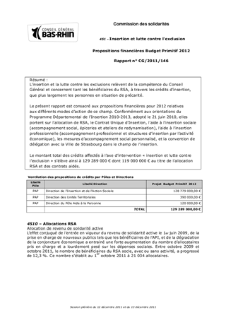 L'insertion et la lutte contre les exclusions relèvent de la compétence du Conseil Général et concernent tant les bénéficiaires du RSA, à travers les crédits dinsertion, que plus largement les personnes en situation de précarité. Le présent rapport est consacré aux propositions financières pour 2012 relatives aux différents modes daction de ce champ. Conformément aux orientations du Programme Départemental de lInsertion 2010-2013, adopté le 21 juin 2010, elles portent sur lallocation de RSA, le Contrat Unique dInsertion, laide à linsertion sociale (accompagnement social, épiceries et ateliers de redynamisation), laide à linsertion professionnelle (accompagnement professionnel et structures dinsertion par lactivité économique), les mesures daccompagnement social personnalisé, et la convention de délégation avec la Ville de Strasbourg dans le champ de linsertion. Le montant total des crédits affectés à laxe dintervention « insertion et lutte contre lexclusion » sélève ainsi à 129 289 000 € dont 119 000 000 € au titre de lallocation RSA et des contrats aidés.