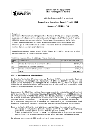 La Direction Territoriale dAménagement du Territoire (DTAT), créée en janvier 2010, avec ses quatre Secteurs Départementaux dAménagement, dUrbanisme et dHabitat (SDAUH) au sein de ses quatre Unités Territoriales dAménagement du Territoire (UTAT), apporte assistance et conseil aux communes et intercommunalités bas-rhinoises qui le souhaitent dans le cadre de lexercice de leurs compétences en matière daménagement et durbanisme. Les crédits inscrits au budget primitif 2012 sélèvent à 935 180,41 euros dont le détail est présenté dans le cadre du présent rapport.