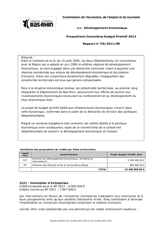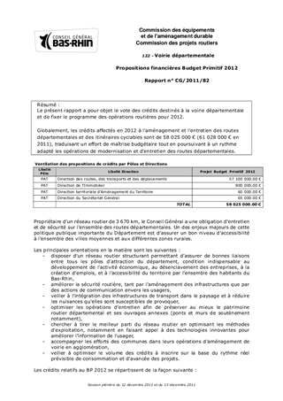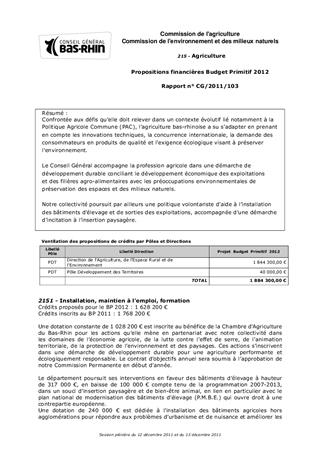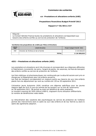 Le Département du Bas-Rhin, aux côtés de la Région Alsace et de la Communauté Urbaine de Strasbourg est de longue date engagé dans une politique volontariste de soutien au développement universitaire et scientifique avec lambition de conforter son potentiel, son attractivité et son rayonnement international, qui participent au développement de leur territoire. Dans le prolongement des orientations de politique générale portées par le Département en matière denseignement supérieur et de recherche, un document commun de planification des engagements à l'horizon 2020 a été adopté en 2009. Le présent rapport présente les propositions de crédits de paiement pour 2012.