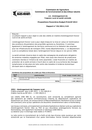 Le présent rapport a pour objet le vote des crédits en matière d'aménagement foncier rural et de santé animale Laménagement foncier rural a pour objet dassurer la mise en valeur et lamélioration des conditions dexploitation des propriétés agricoles ou forestières. Il contribue également à laménagement du territoire communal et à la libération des emprises pour les infrastructures de transport (TGV, routes départementales ). Le département a pris la compétence totale dans laménagement foncier depuis le 1er janvier 2006. La santé animale s'exerce dans le cadre des campagnes de prophylaxie obligatoire de certaines maladies engagées par l'Etat, mais aussi des mesures de prophylaxie volontaire menées à l'initiative de notre assemblée. L'aide financière en matière de protection de la santé animale s'inscrit dans le cadre de la surveillance des élevages (prophylaxie) et des plans de lutte contre des maladies à incidence économique sévissant dans le département.