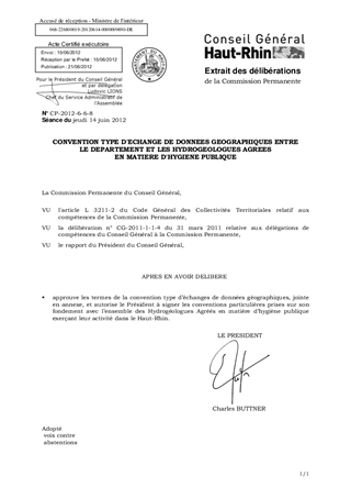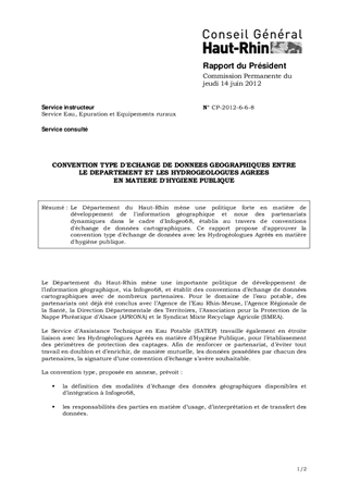 Le Département du Haut-Rhin mène une politique forte en matière de développement de l'information géographique et noue des partenariats dynamiques dans le cadre d'Infogeo68, établis au travers de conventions d'échange de données cartographiques. Ce rapport propose d'approuver la convention type d'échange de données avec les Hydrogéologues Agréés en matière d'hygiène publique.