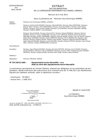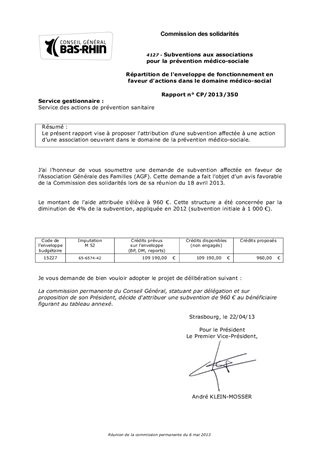 Le Conseil Général du Bas-Rhin accorde chaque année des aides financières aux structures en charge de l'insertion des bénéficiaires du RSA. Afin de réduire les délais de mise en paiement et favoriser un meilleur équilibre de leur trésorerie, la commission permanente du 4 février 2013 a fixé les montants des subventions 2013 accordées à ces structures et leur a octroyé une avance de 70 %, sur la base des subventions 2012. Il vous est proposé de réviser les subventions 2013 pour deux d'entre elles, qui ont déposés des demandes de subvention inférieures aux montants votés.