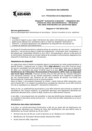 Le présent rapport a pour objet l'attribution des aides individuelles aux personnes âgées ayant déposé leur candidature dans le cadre du dispositif 'Autonomie à Domicile'. Il propose également une adaptation du dispositif afin de préciser les critères de sélection des bénéficiaires.