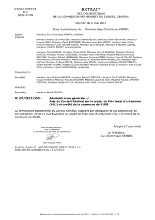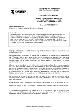 Le Département suit l'élaboration de l'ensemble des Plans Locaux d'Urbanisme sur le territoire bas-rhinois, au titre de sa mission de ' Personne publique associée ' aux documents d'urbanisme. La commune de Russ finalise actuellement son projet et arrive en phase de PLU ' arrêté '. Conformément à l'article L.123-9 du Code de l'Urbanisme, ces documents sont transmis au Département, pour qu'il fasse connaître son avis, en tant que personne publique associée.