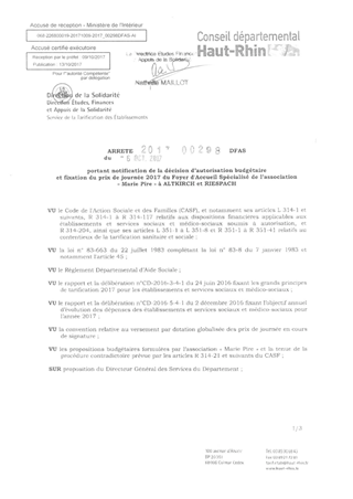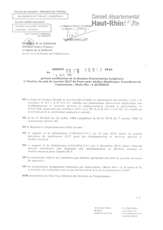 portant notification de la décision d'autorisation budgétaire et fixation du prix de journée 2017 du foyer pour adultes handicapés travailleurs de l'association "Marie Pire" à ALTKIRCH