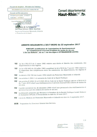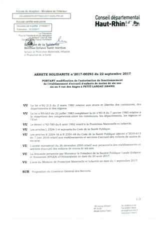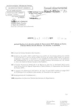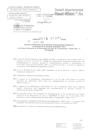 portant notification de la décision d'autorisation budgétaire et fixation de la dotation globalisée 2017 du centre d'accueil et de rencontre de jour de l'association "Marie Pire" à ALTKIRCH