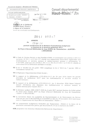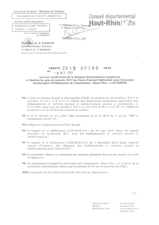 portant notification de la décision d'autorisation budgétaire et fixation du prix de journée 2017 du foyer d'accueil spécialisé pour personnes handicapées vieillissantes de l'association "Marie Pire" à ALTKIRCH