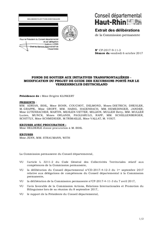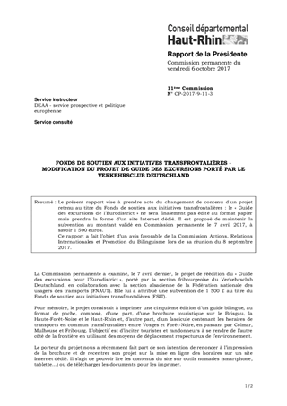 Le présent rapport vise à prendre acte du changement de contenu d’un projet retenu au titre du Fonds de soutien aux initiatives transfrontalières : le « Guide des excursions de l’Eurodistrict » ne sera finalement pas édité au format papier mais prendra la forme d’un site Internet dédié. Il est proposé de maintenir la subvention au montant validé en Commission permanente le 7 avril 2017, à savoir 1 500 euros. Ce rapport a fait l’objet d’un avis favorable de la Commission Actions, Relations Internationales et Promotion du Bilinguisme lors de sa réunion du 8 septembre 2017.