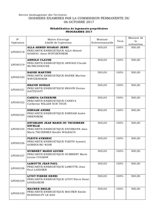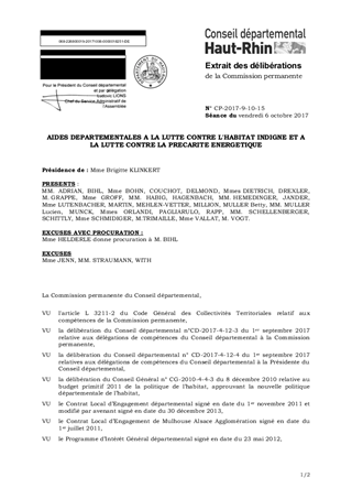 Dans le cadre des aides départementales à la lutte contre l’habitat indigne et du programme « Habiter Mieux » en faveur de la précarité énergétique pour les propriétaires occupants et bailleurs, il vous est proposé de retenir 26 dossiers pour une subvention totale de 88 750 € dont 53 250 € dans le cadre des opérations programmées mulhousiennes. La commission Solidarité, Famille, Insertion et Logement a exprimé un avis favorable en date du 29 septembre 2017.