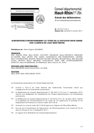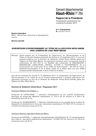 Après examen par la Commission de l'Agriculture, de l'Environnement et du Cadre de Vie des dossiers présentés les 30 juin et 15 septembre 2017, il vous est proposé d'affecter sur la Dotation de Solidarité Urbain-Rural (DSUR), gérée par l'Agence de l'Eau Rhin-Meuse, les opérations suivantes, pour un montant total de subventions de 625 993 €, au bénéfice des communes de BELLEMAGNY, BERNWILLER, LAPOUTROIE, LINTHAL, LUTTER et THANNENKIRCH, de la Communauté de Communes de la Vallée de Saint-Amarin , des SIA de Lauw-Sentheim-Guewenheim et de la Basse Vallée de la Doller ainsi que des SIAEP d'Ammertzwiller-Balschwiller et de la Vallée de la Doller.