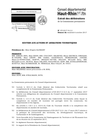Dans le cadre de la politique départementale de soutien aux actions et animations touristiques, il est proposé d'attribuer : - une subvention de 20 000 € à l'Association "Journées d'Octobre" pour l'édition 2017 de la manifestation "Folie Flore", - une subvention de 10 000 € à la Ville d'Altkirch pour l'édition 2017 de la manifestation "La Forêt Enchantée". Ce rapport a fait l'objet d'un avis favorable de la Commission de l'Aménagement du Territoire et de l'Economie lors de sa réunion du 22 septembre 2017.