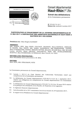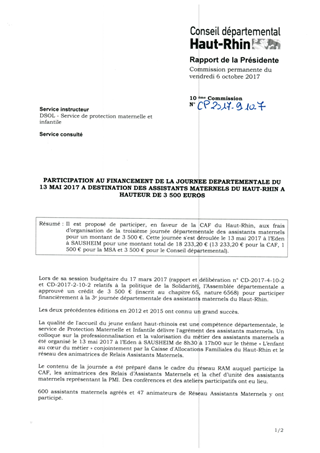 PARTICIPATION AU FINANCEMENT DE LA JOURNEE DEPARTEMENTALE DU 13 MAI 2017 A DESTINATION DES ASSISTANTS MATERNELS DU HAUT-RHIN A HAUTEUR DE 3 500 EUROS