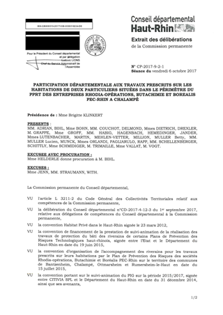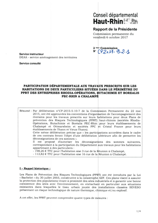 PARTICIPATION DÉPARTEMENTALE AUX TRAVAUX PRESCRITS SUR LES HABITATIONS DE DEUX PARTICULIERS SITUÉES DANS LE PÉRIMÈTRE DU PPRT DES ENTREPRISES RHODIA-OPÉRATIONS, BUTACHIMIE ET BOREALIS PEC-RHIN A CHALAMPÉ