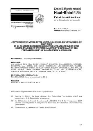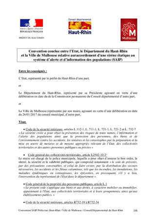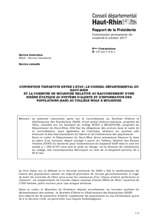 CONVENTION TRIPARTITE ENTRE L'ETAT, LE CONSEIL DÉPARTEMENTAL DU HAUT-RHINET LA COMMUNE DE MULHOUSE RELATIVE AU RACCORDEMENT D'UNE SIRÈNE ÉTATIQUE AU SYSTÈME D'ALERTE ET D'INFORMATION DES POPULATIONS (SAIP) AU COLLÈGE WOLF À MULHOUSE