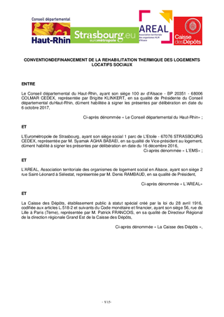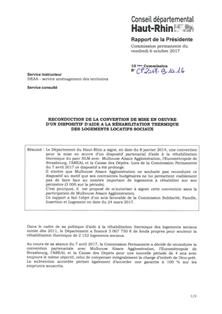 Le Département du Haut-Rhin a signé, en date du 8 janvier 2014, une convention pour la mise en œuvre d’un dispositif partenarial d’aide à la réhabilitation thermique du parc HLM avec Mulhouse Alsace Agglomération, l’Eurométropole de Strasbourg, l’AREAL et la Caisse des Dépôts. Lors de la Commission Permanente du 7 avril 2017 ce dispositif a été prolongé. Il s’avère que Mulhouse Alsace Agglomération ne souhaite pas reconduire ce dispositif au motif que ses contraintes budgétaires ne lui permettent visiblement pas de faire face au nombre important de logements à réhabiliter sur son périmètre (3 000 sur la période). C’est pourquoi, il est proposé de m'autoriser à signer cette convention sans la participation de Mulhouse Alsace Agglomération. Ce rapport a fait l'objet d'un avis favorable de la Commission Solidarité, Famille, Insertion et Logement en date du 24 mars 2017.