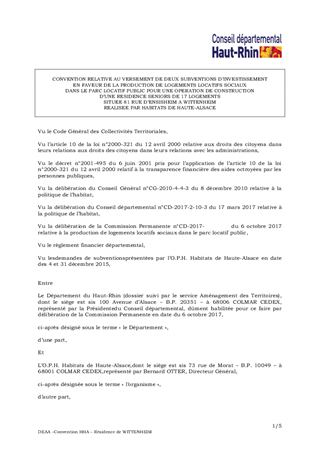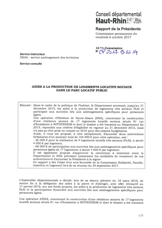 Dans le cadre de la politique de l’habitat, le Département soutenait, jusqu’au 31 décembre 2015, les aides à la production de logements très sociaux PLAI et participait aux surcoûts liés aux aménagements spécifiques pour personnes âgées. Une opération d’Habitats de Haute-Alsace (HHA), concernant la construction d’une résidence seniors de 17 logements locatifs sociaux situés 81 rue d’Ensisheim à WITTENHEIM et dont le dossier a été transmis au Département fin 2015, répondait aux critères d’éligibilité en vigueur au 31 décembre 2015, mais n’a pas pu être prise en compte en 2016 pour des raisons budgétaires. Aussi, il vous est proposé, à titre exceptionnel, d’accorder deux subventions forfaitaires d’un montant total de 104 000 € pour cette opération, soit : - 36 000 € pour la réalisation de 9 logements locatifs très sociaux (PLAI), à savoir 4 000 € par logement, - 68 000 € de participation aux surcoûts liés aux aménagements spécifiques pour personnes âgées de 17 logements, à savoir 4 000 € par logement. Il est également proposé d’approuver la convention à intervenir entre le Département et HHA précisant notamment les modalités de versement de ces subventions et d’autoriser la Présidente à la signer. Ce rapport a fait l’objet d’un avis favorable de la Commission Solidarité, Famille, Insertion et Logement lors de sa réunion du 29 septembre 2017.