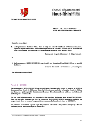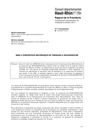 Dans le cadre du GERPLAN de la Communauté de Communes Pays Rhin-Brisach, la commune de ROGGENHOUSE souhaite créer un verger-école le long du canal déclassé du Rhône au Rhin. Le Département ayant par erreur implanté une piste cyclable sur une partie de l’emprise communale destinée à cette opération, il convient de régulariser la situation afin de permettre à la commune de réaliser son projet. A cet effet, le présent rapport a pour objet d’autoriser la signature d’une convention de mise à disposition réciproque de terrains à ROGGENHOUSE, pour une durée de 30 ans, à titre gratuit.