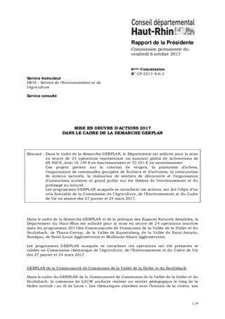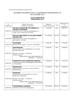 Dans le cadre de la démarche GERPLAN, le Département est sollicité pour la mise en œuvre de 24 opérations représentant un montant global de subventions de 69 400 €, dont 16 149 € en fonctionnement et 53 251 € en investissement. Ces projets portent sur la création de vergers, la plantation d’arbres, l’organisation de commandes groupées de fruitiers et d’arbustes, la restauration de milieux naturels, la réalisation de sentiers de découverte et l’organisation d’animations scolaires et grand public sur les thèmes de l’environnement et du jardinage au naturel. Les programmes GERPLAN auxquels se rattachent ces actions, ont fait l’objet d’un avis favorable de la Commission de l’Agriculture, de l’Environnement et du Cadre de Vie en séance des 27 janvier et 24 mars 2017.